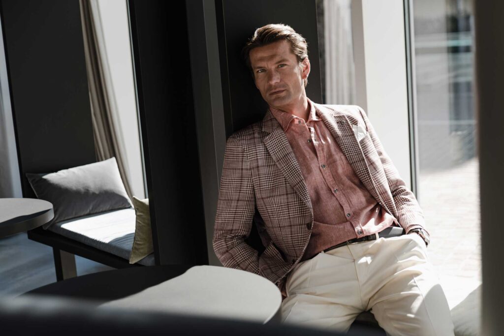 Once your measurements have been taken, you can choose from more than 1,000 variations of available fabrics, fine buttons, jacquard or silk linings. Among the most popular hand-stitched steps we suggest hand buttonholes, tailored cross-stitched collar, hand-stitching on lapels, topstitching on seams, and the flower stop loop. These are details synonymous with elegance and tailoring, recognizable as such only by businessmen with a culture toward modern tailoring and Be Spoke in general.